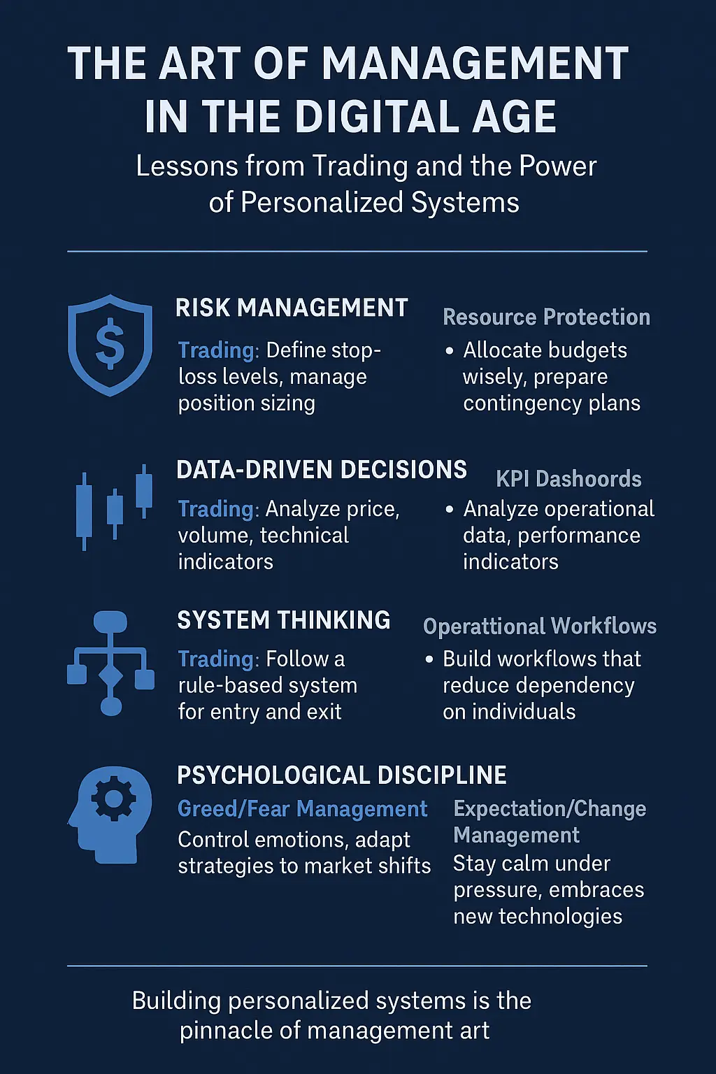 Let’s begin with a surprising contrast: the chaotic, high-speed world of financial markets versus the demand for stability and long-term strategy in enterprise or IT management. At first glance, they seem worlds apart. But beneath the surface, successful trading and excellent management share the same core: mastery of risk, data-driven decision-making, system thinking, psychological discipline, and relentless adaptability.